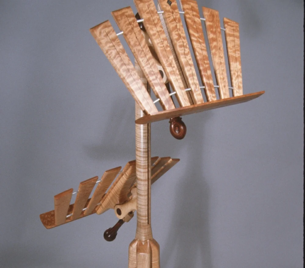 DESCRIPTION: This piece evokes natural forms and distinct Art Deco influences. The music holders adjust in height and tilt independently for both sitting and standing.