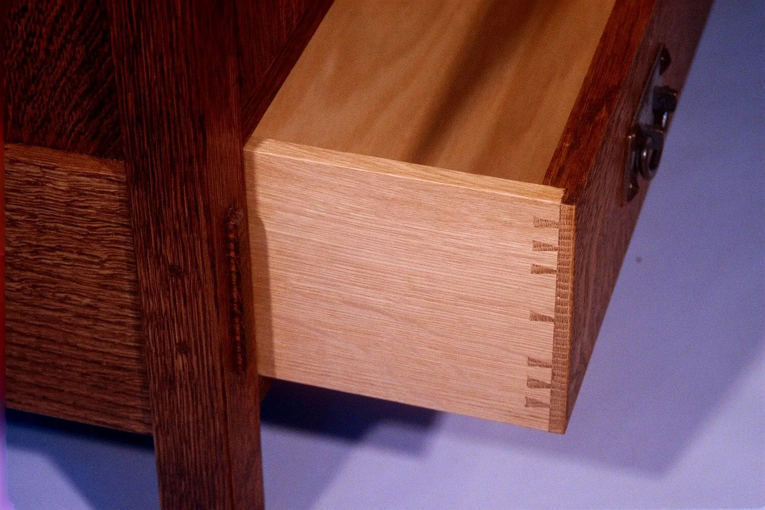 DESCRIPTION: Done in the Arts & Crafts style, this cabinet features bookmatched panels on doors and sides, and hammered copper pulls.