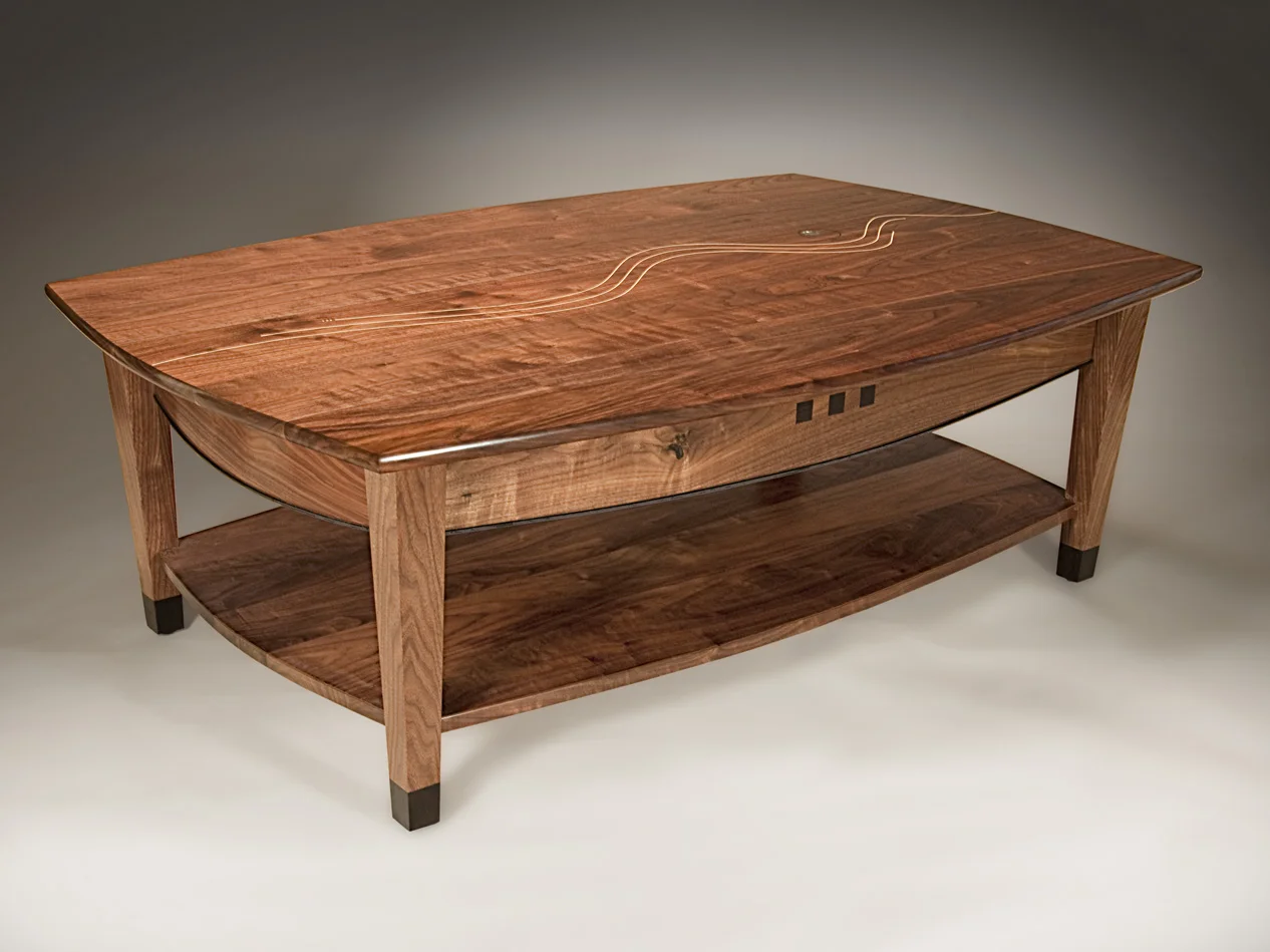 DESCRIPTION: This coffee table provides a large surface area for game playing and puzzles, and sports a handy storage drawer as well as a floating shelf. It's look is softened by gentle curves to the top, shelf, and rails.