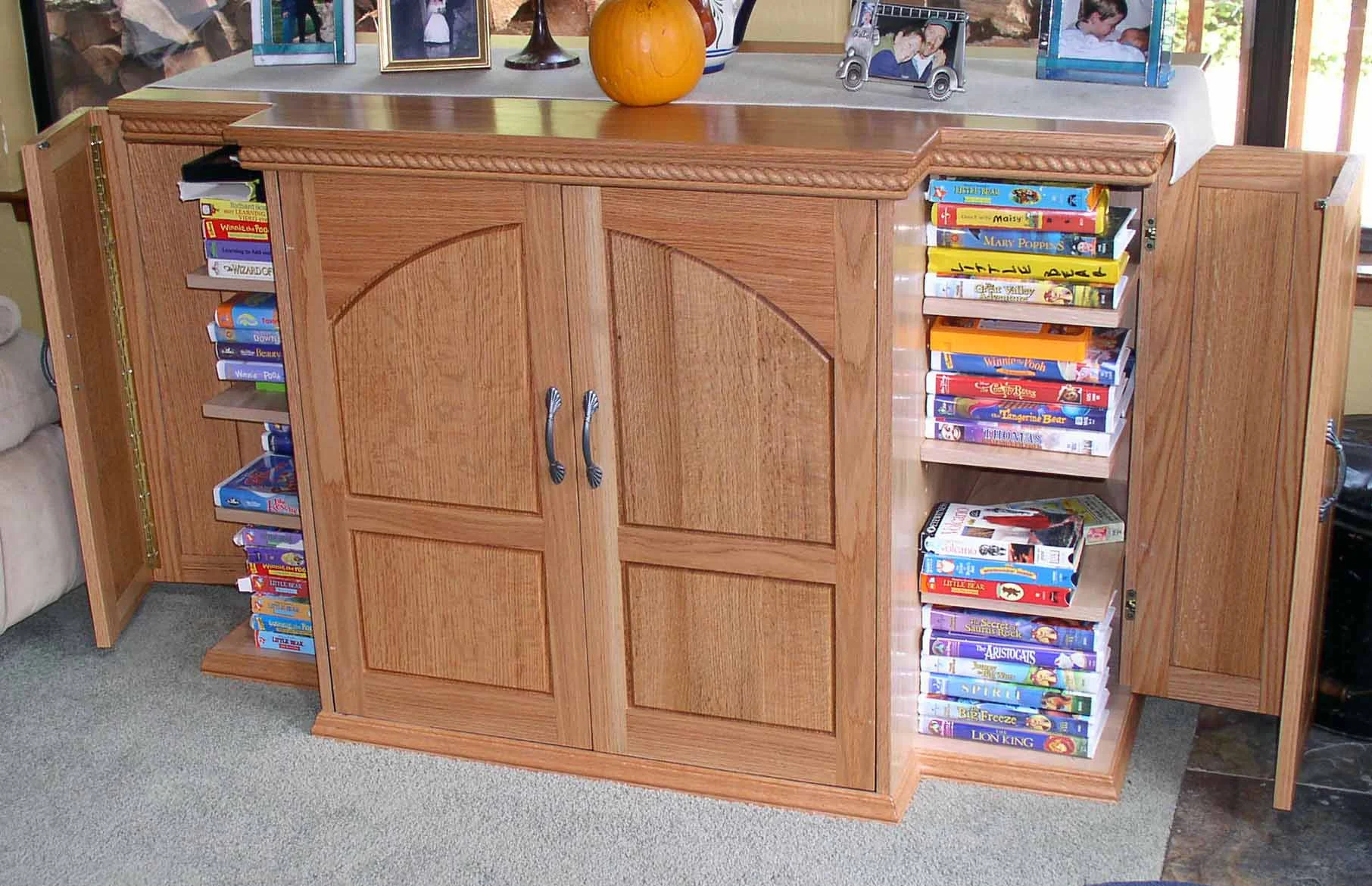 DESCRIPTION: This piece provides a hiding place for a TV, as well as storage for media.